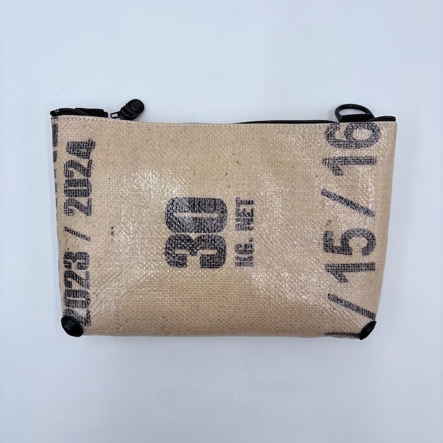 <KISSACOについて> コーヒーの麻袋に両面コーティングを施し、防水性のある生地に仕上げています。 一点一点、絵柄に合わせて製作するオンリーワンのアイテムです。 近所へのお出掛けや旅行の際や、リュックのサブバッグとしても使える防水性のある軽量バッグです。 男女問わずお持ちいただけるデザインです。 携帯電話やお財布、iPadなどが入るサイズ感です。 取り外し可能なアジャストできるショルダーストラップで、斜め掛け、ショルダーバッグ、クラッチバッグとしてもお使いただけます。 バッグインバッグとしてもおすすめです。 表面はPVC加工しているので防水性があります。裏面は綿ツイルを圧着しており、四つ角にも硬めのクローム革を当てているので長くお使いいただけます。 シンプルな装いのアクセントとなり、華やかな雰囲気になります。 素材 / 麻・綿・塩化ビニール・革 H17㎝×W25㎝×D5.5㎝ ショルダーの長さ 約130㎝(最長)