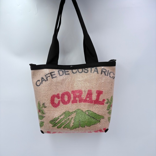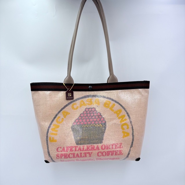 コーヒーの麻袋に両面コーティングを施し、防水性のある生地に仕上げています。 一点一点、絵柄に合わせてレザーやテープをセレクトしたオンリーワンのアイテムです。 A4サイズが収納できて軽量なので、お仕事などにも使いやすいバッグです。 16インチのパソコンを横向きで入れて、ホックが止まります。 PC、お財布、カードケース、手帖、携帯電話、水筒、などがきれいに収まり、それでもまだ余裕があるサイズ感です。 携帯などを収納できるポケットが付いています。 シンプルな装いのアクセントとなり、華やかな雰囲気になります。 素材 / 麻・綿・塩化ビニール・革 H30㎝×W(口前)37㎝(底)26㎝×D13㎝ 持ち手の長さ 立ち上がり30㎝