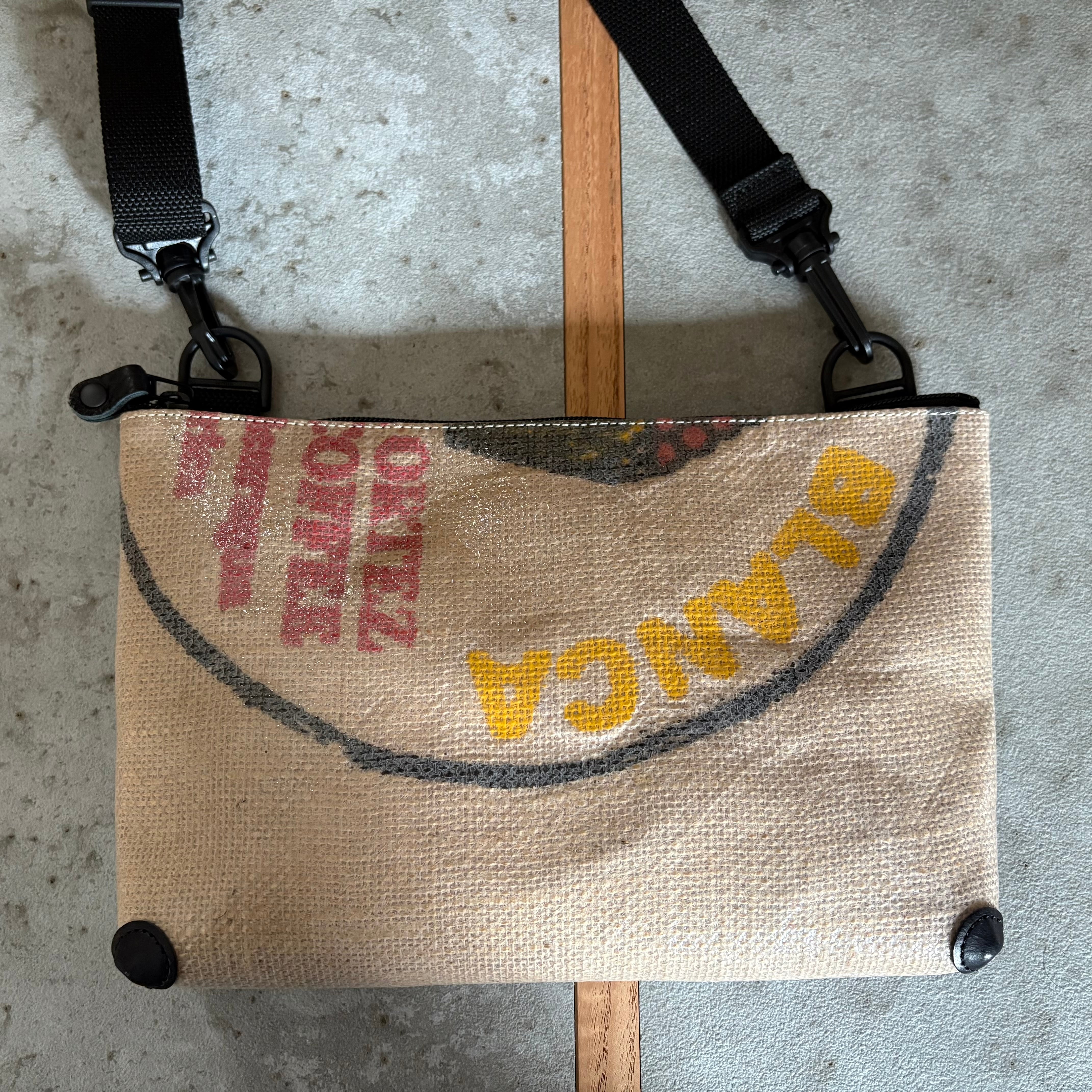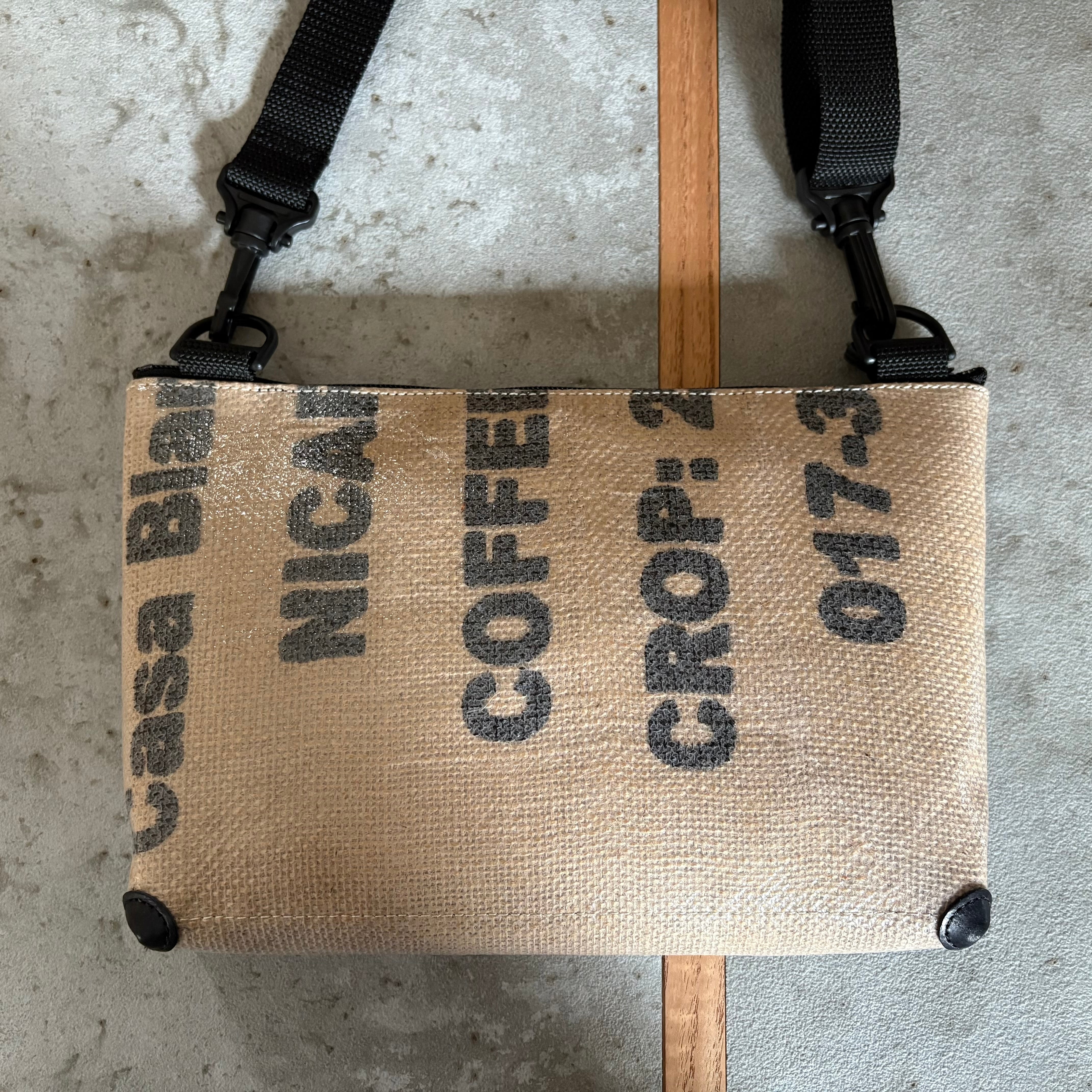 コーヒーの麻袋に両面コーティングを施し、防水性のある生地に仕上げています。