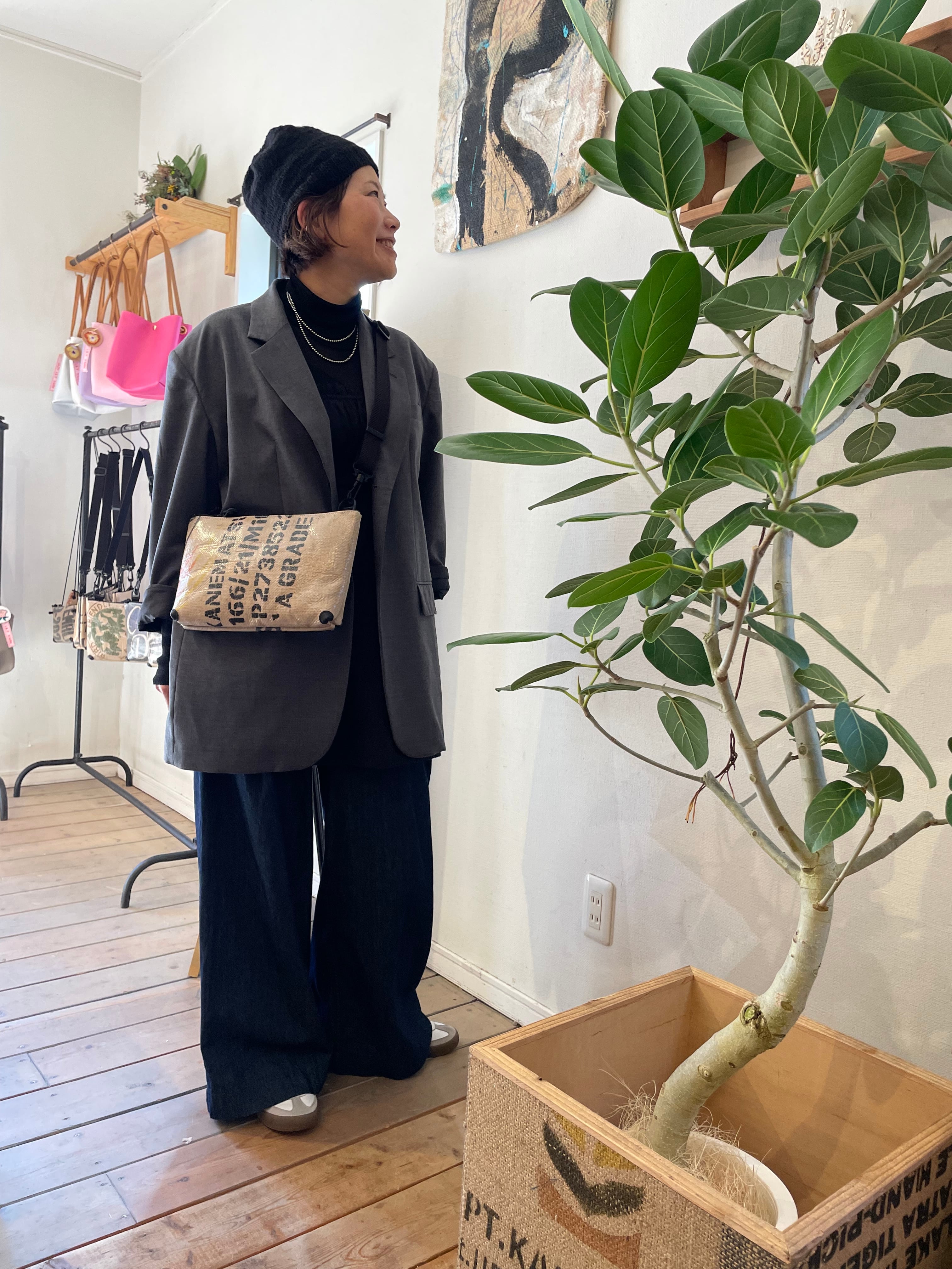 コーヒーの麻袋に両面コーティングを施し、防水性のある生地に仕上げています。
