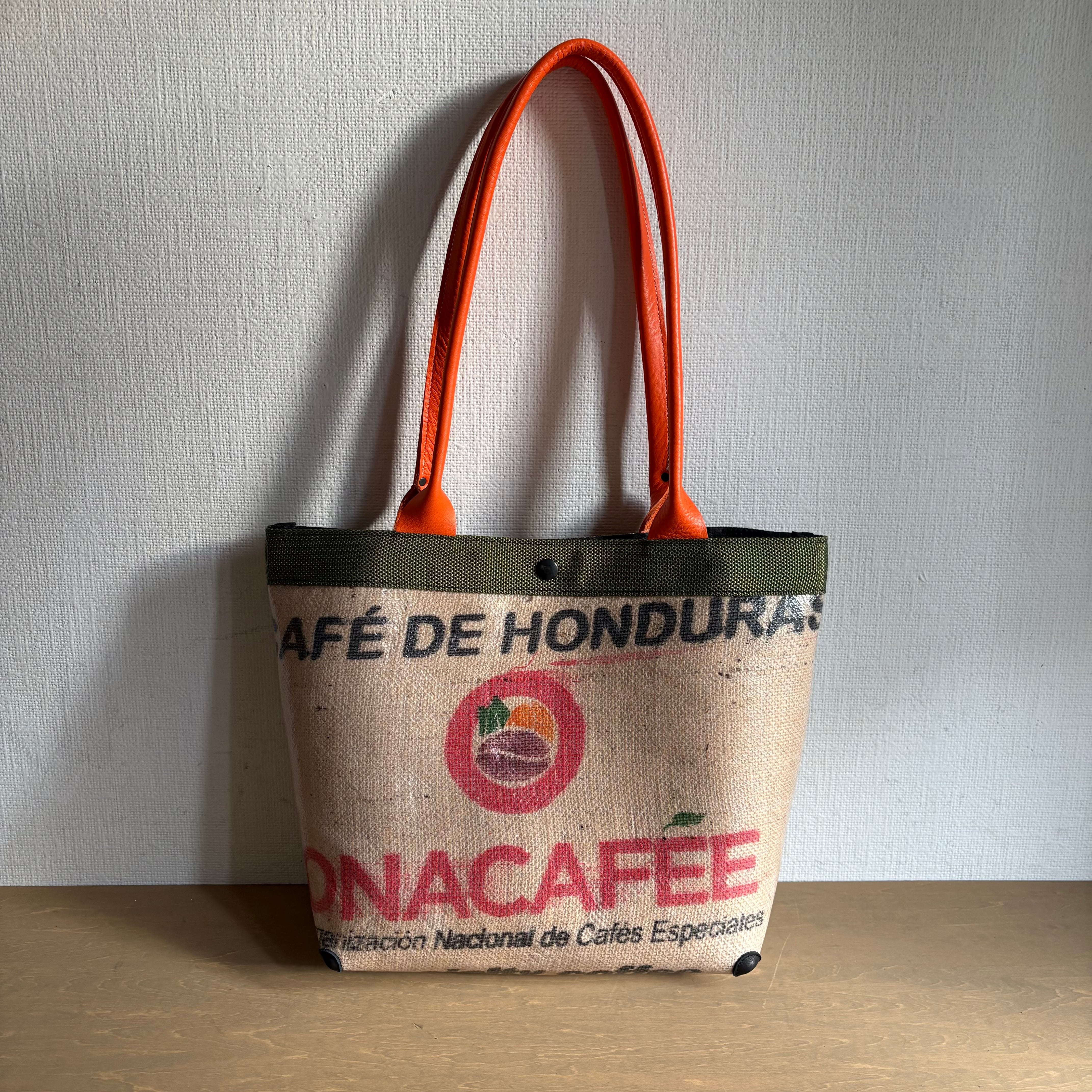 コーヒーの麻袋に両面コーティングを施し、防水性のある生地に仕上げています。
