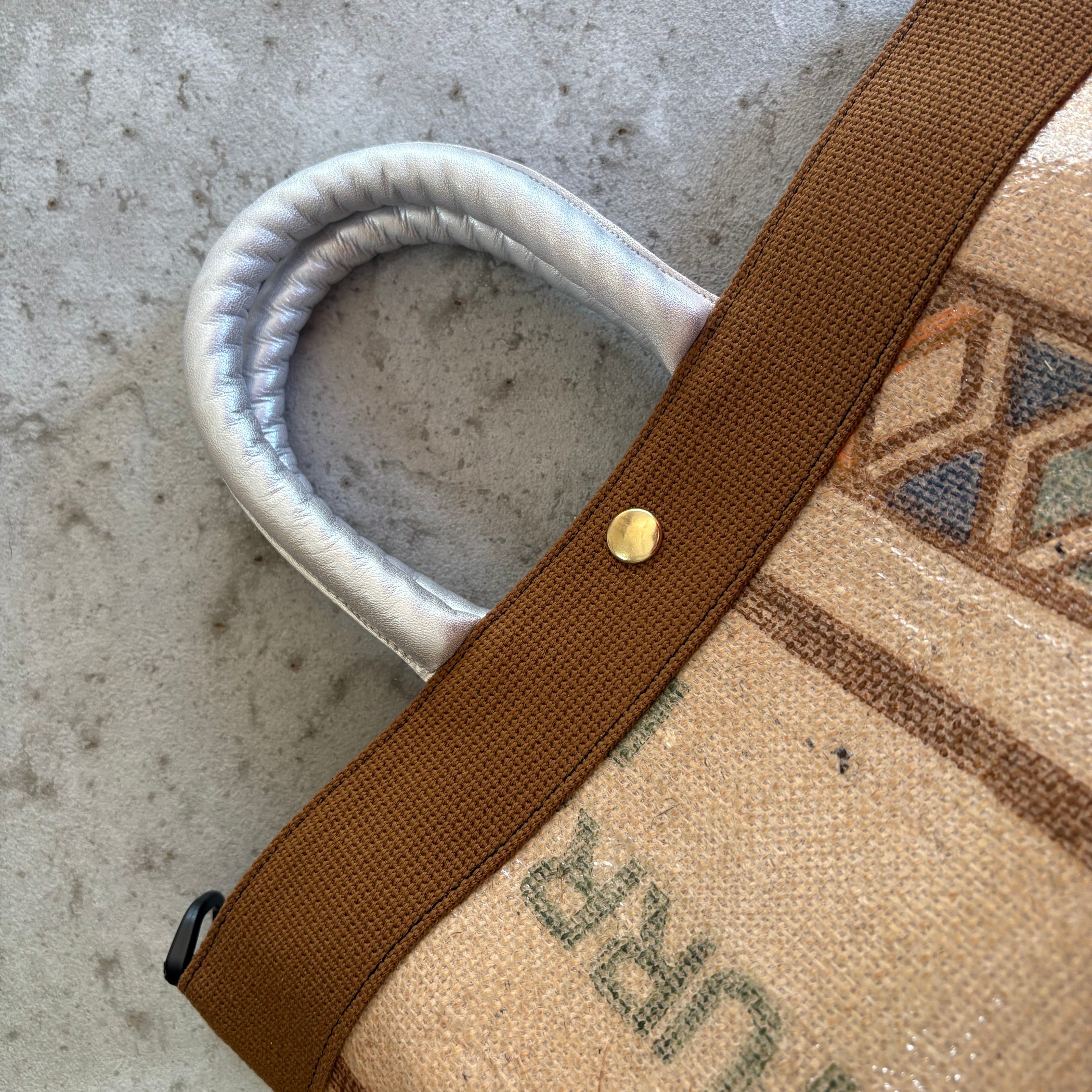 表面はPVC加工し、裏面は綿ツイルを圧着しており、口前や四つ角にも革を当てているので長くお使いいただけます。
