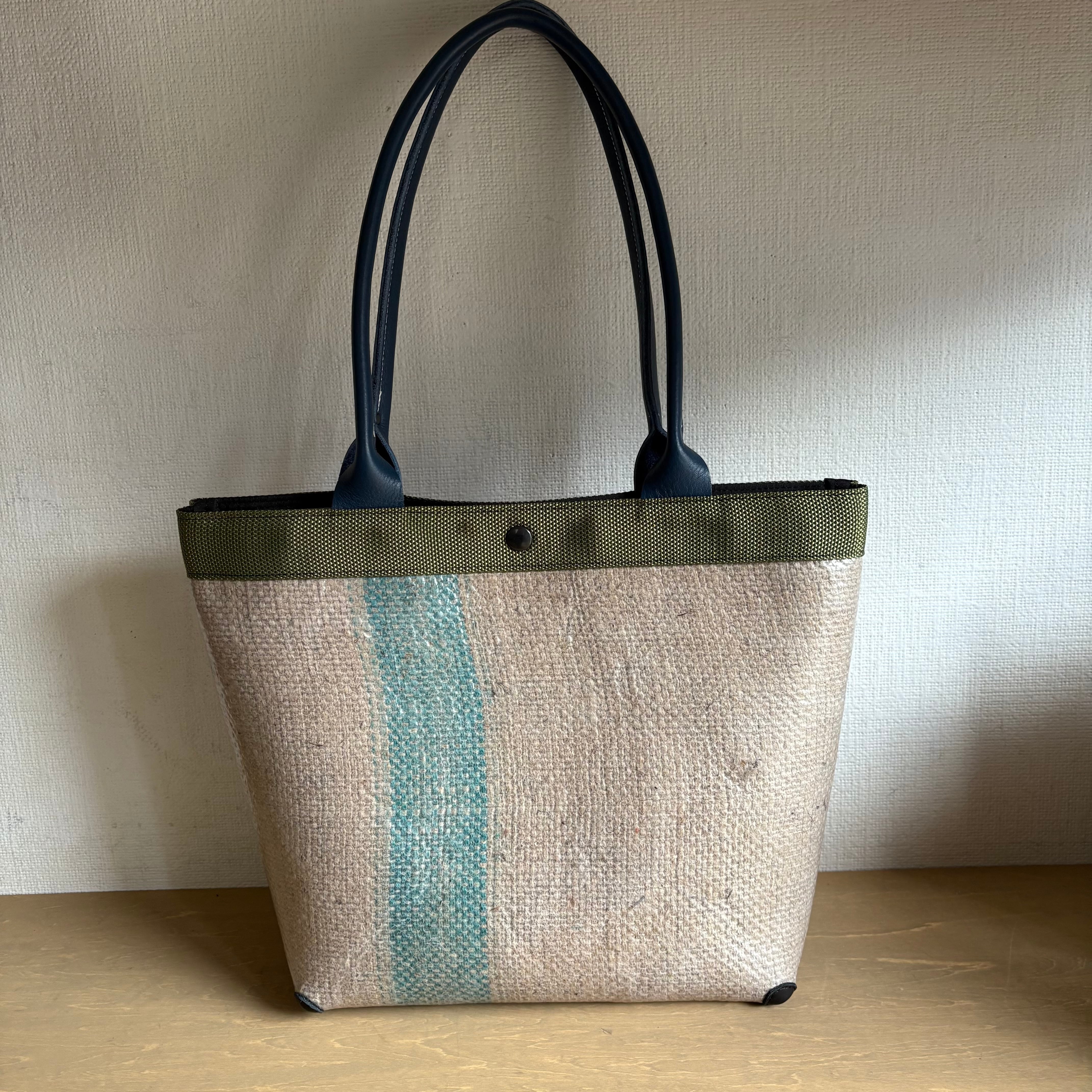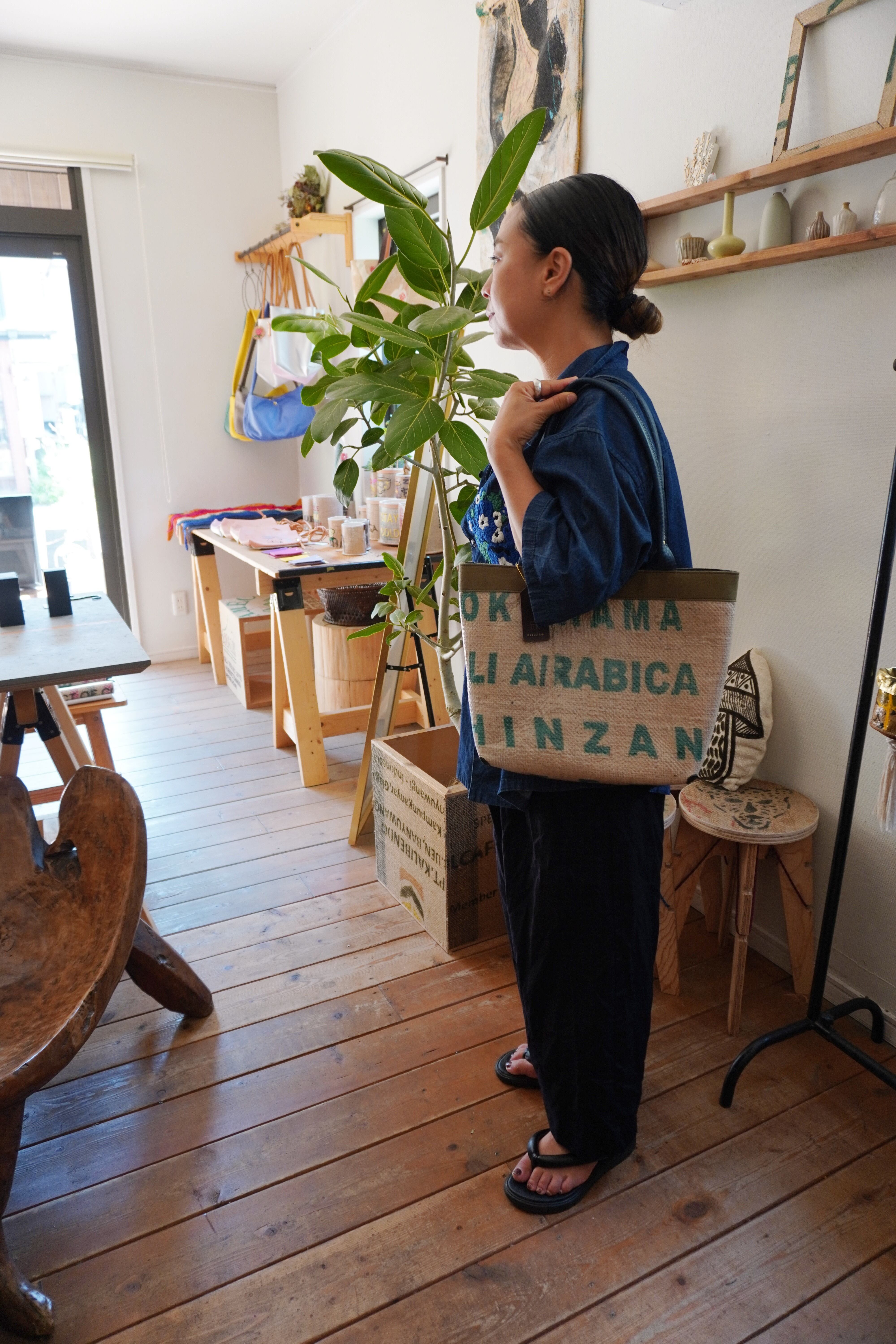 コーヒーの麻袋に両面コーティングを施し、防水性のある生地に仕上げています。