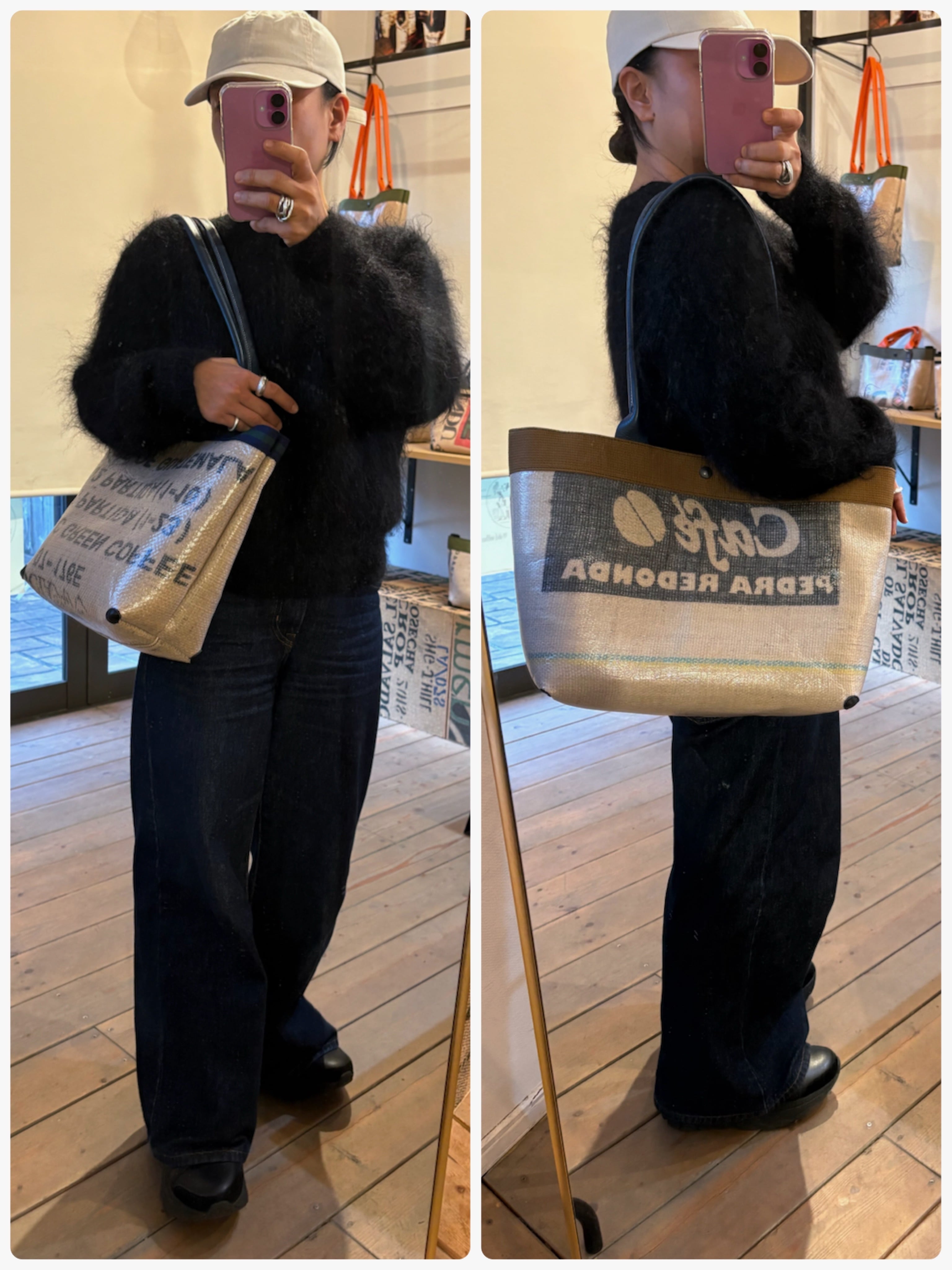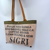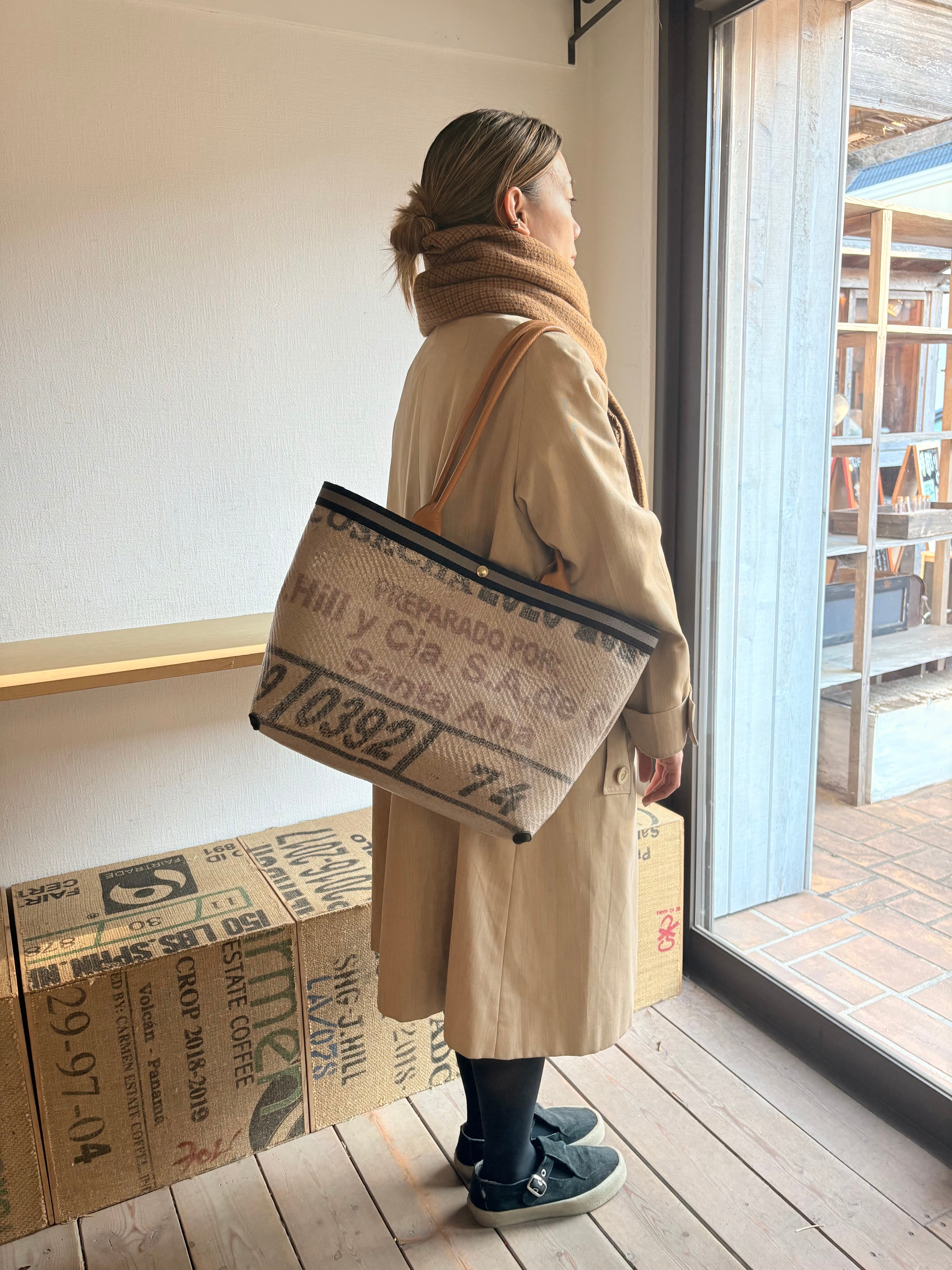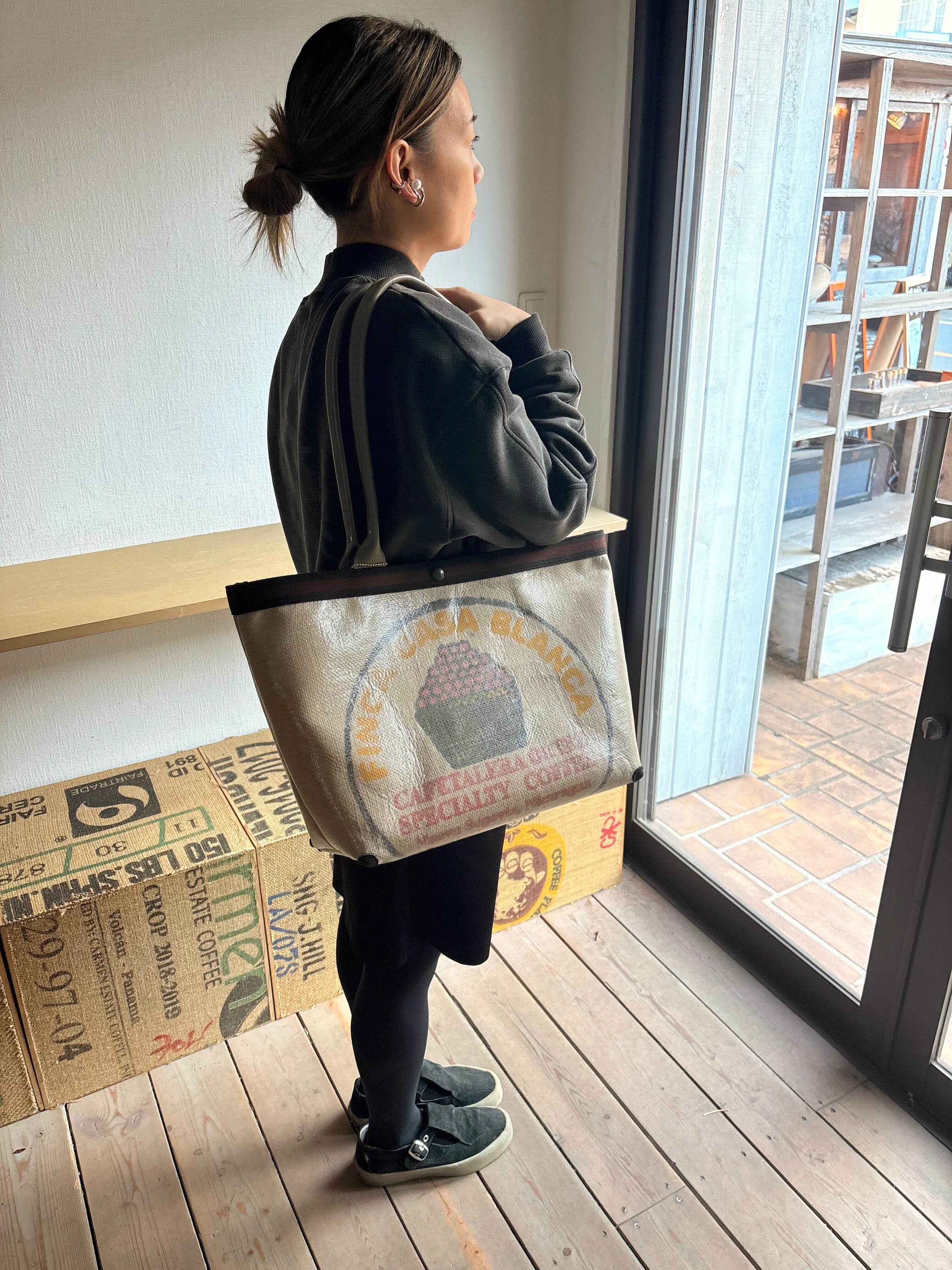 コーヒーの麻袋に両面コーティングを施し、防水性のある生地に仕上げています。