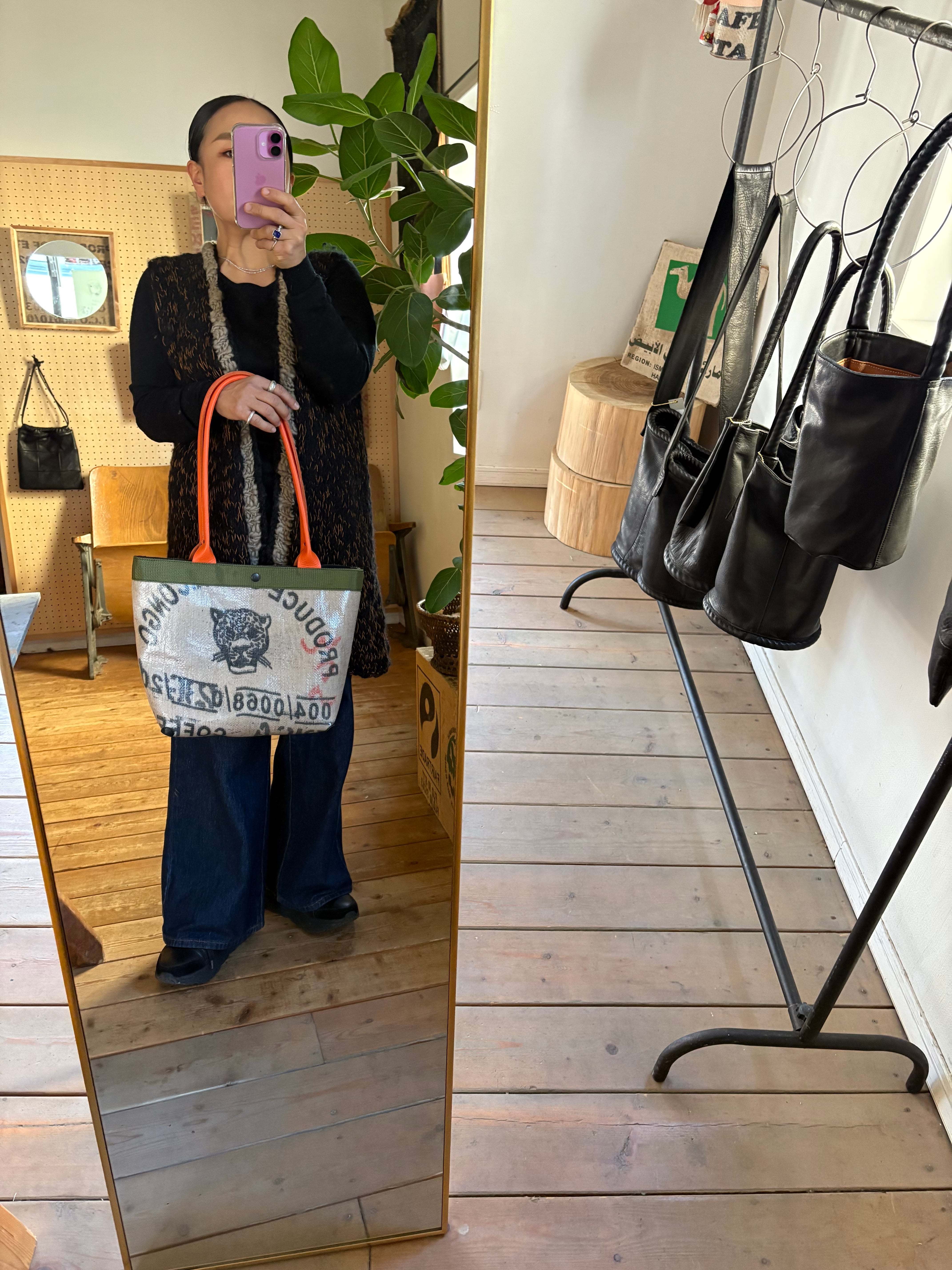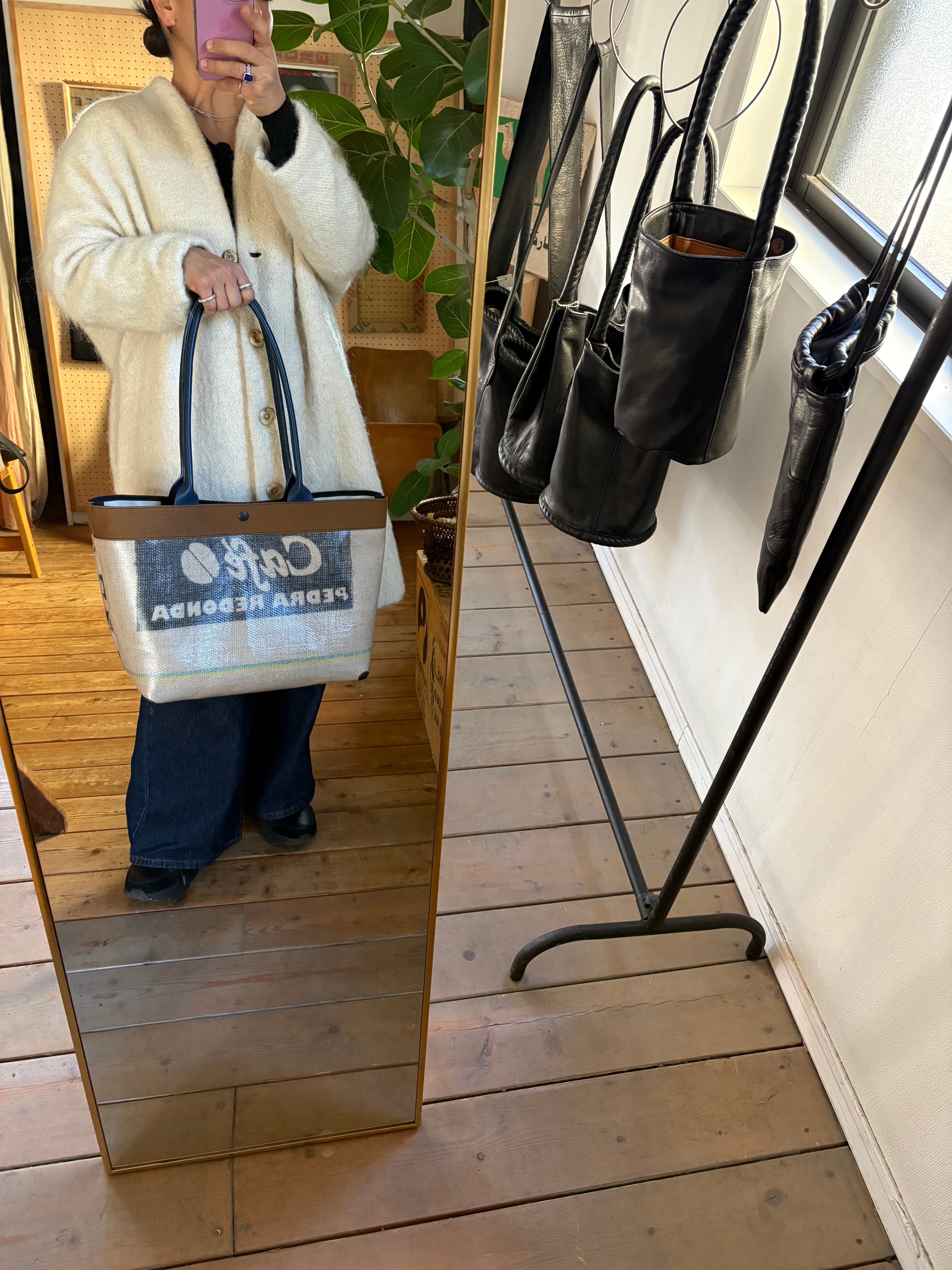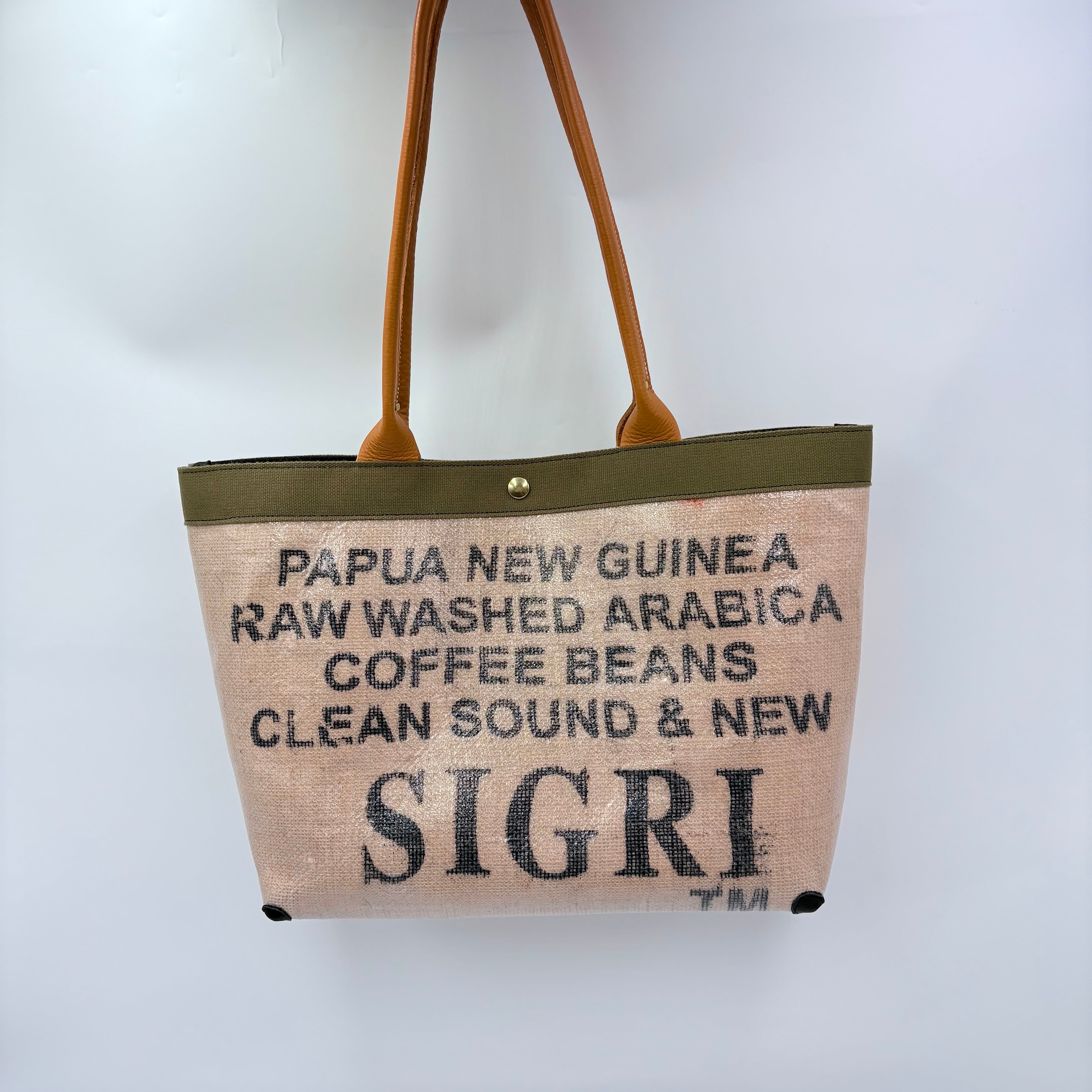 コーヒーの麻袋に両面コーティングを施し、防水性のある生地に仕上げています。