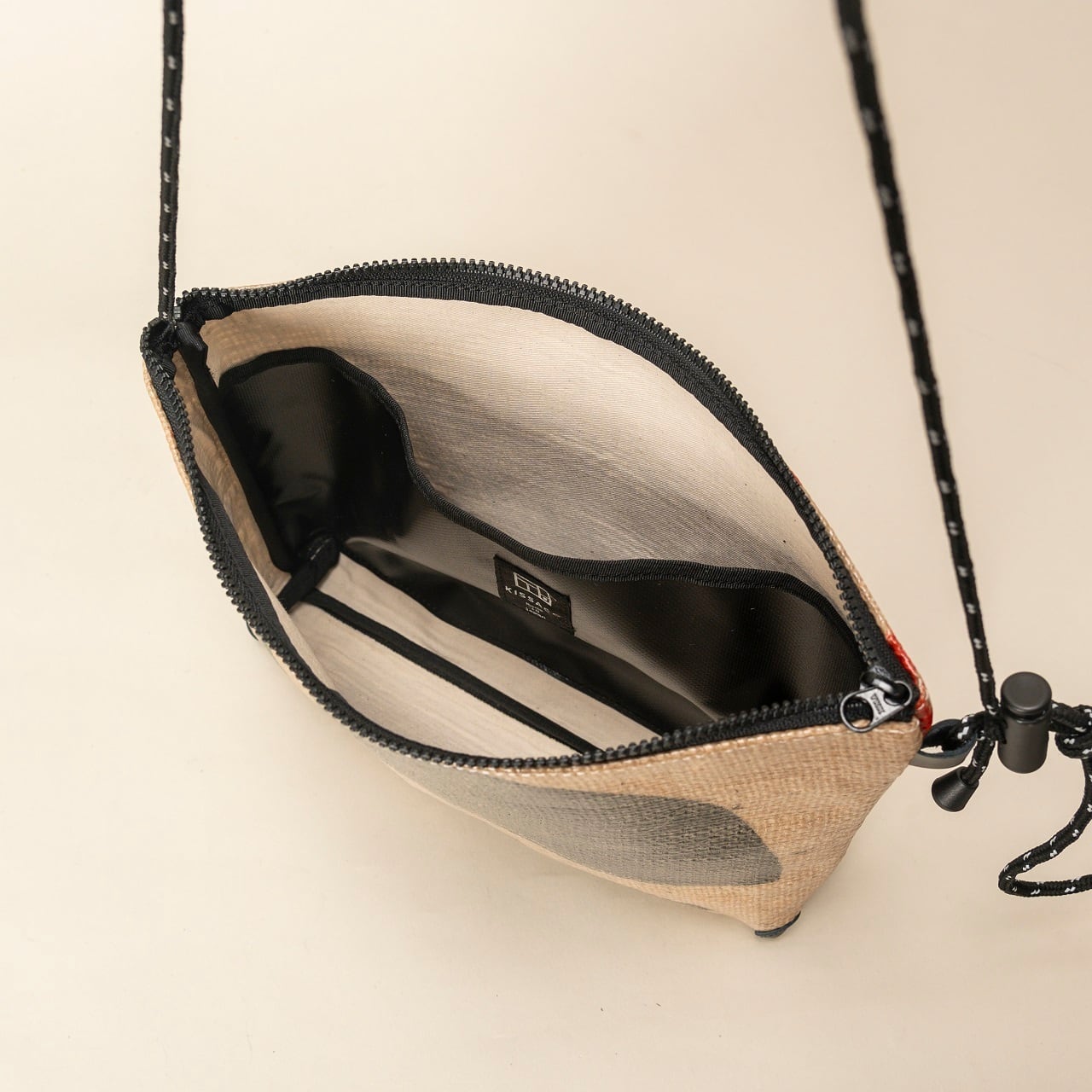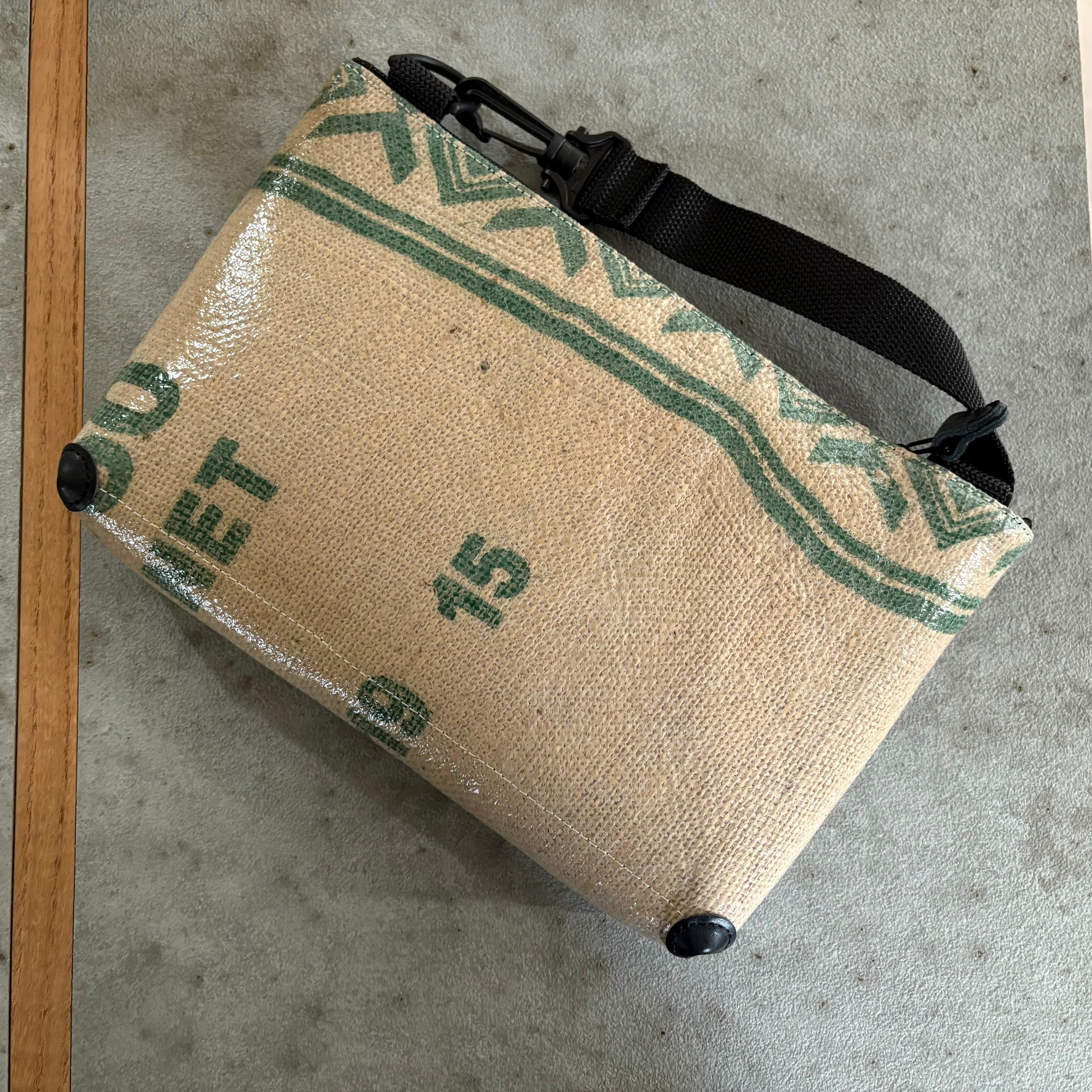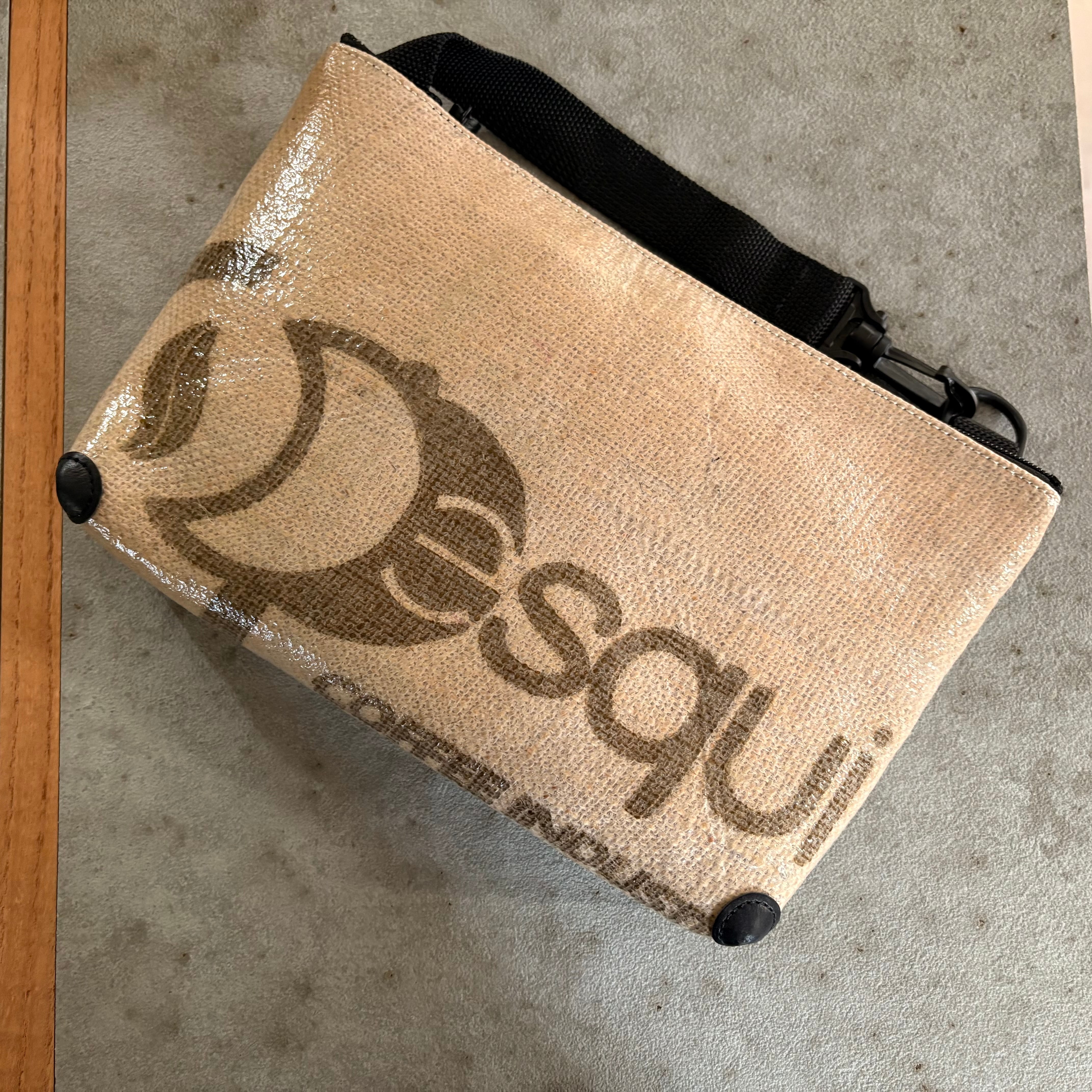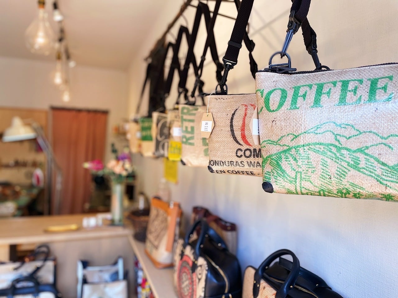 コーヒーの麻袋に両面コーティングを施し、防水性のある生地に仕上げています。